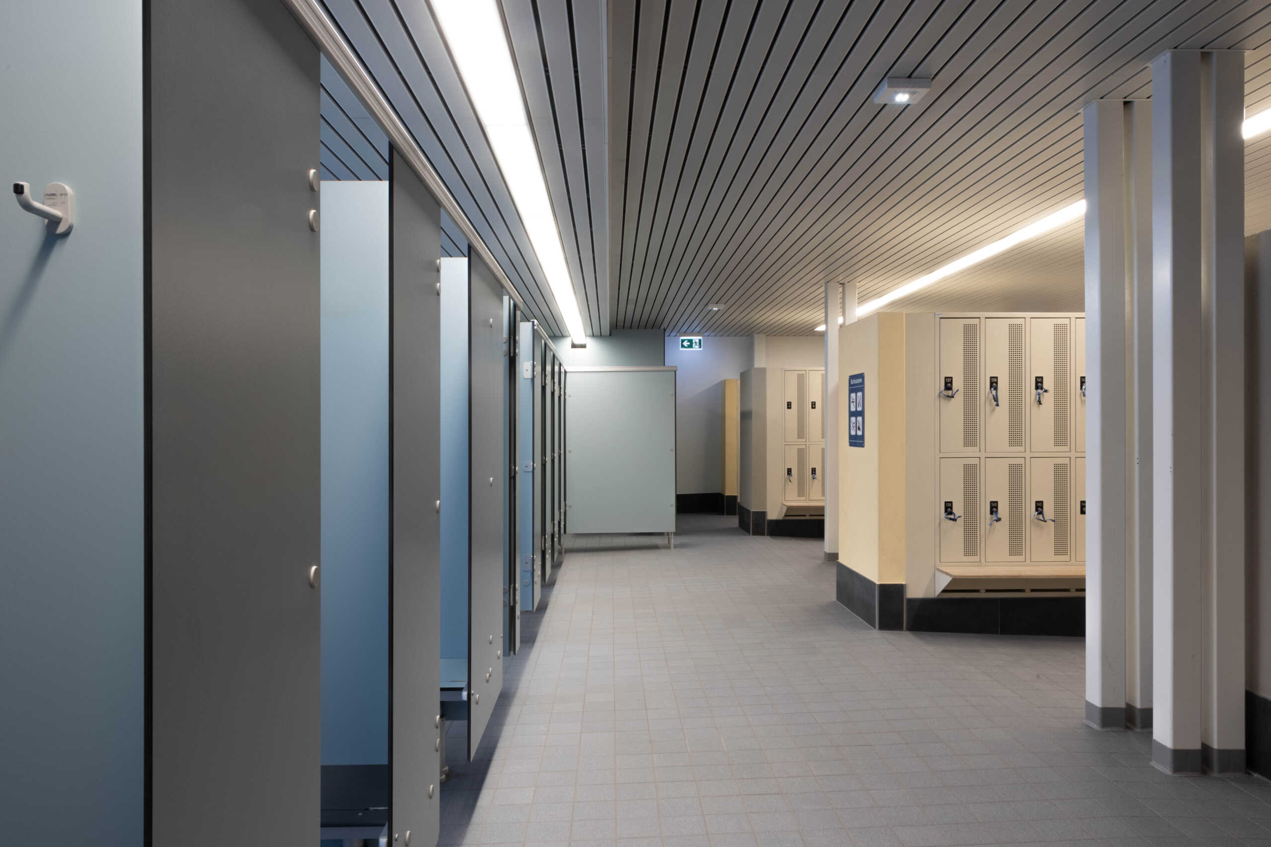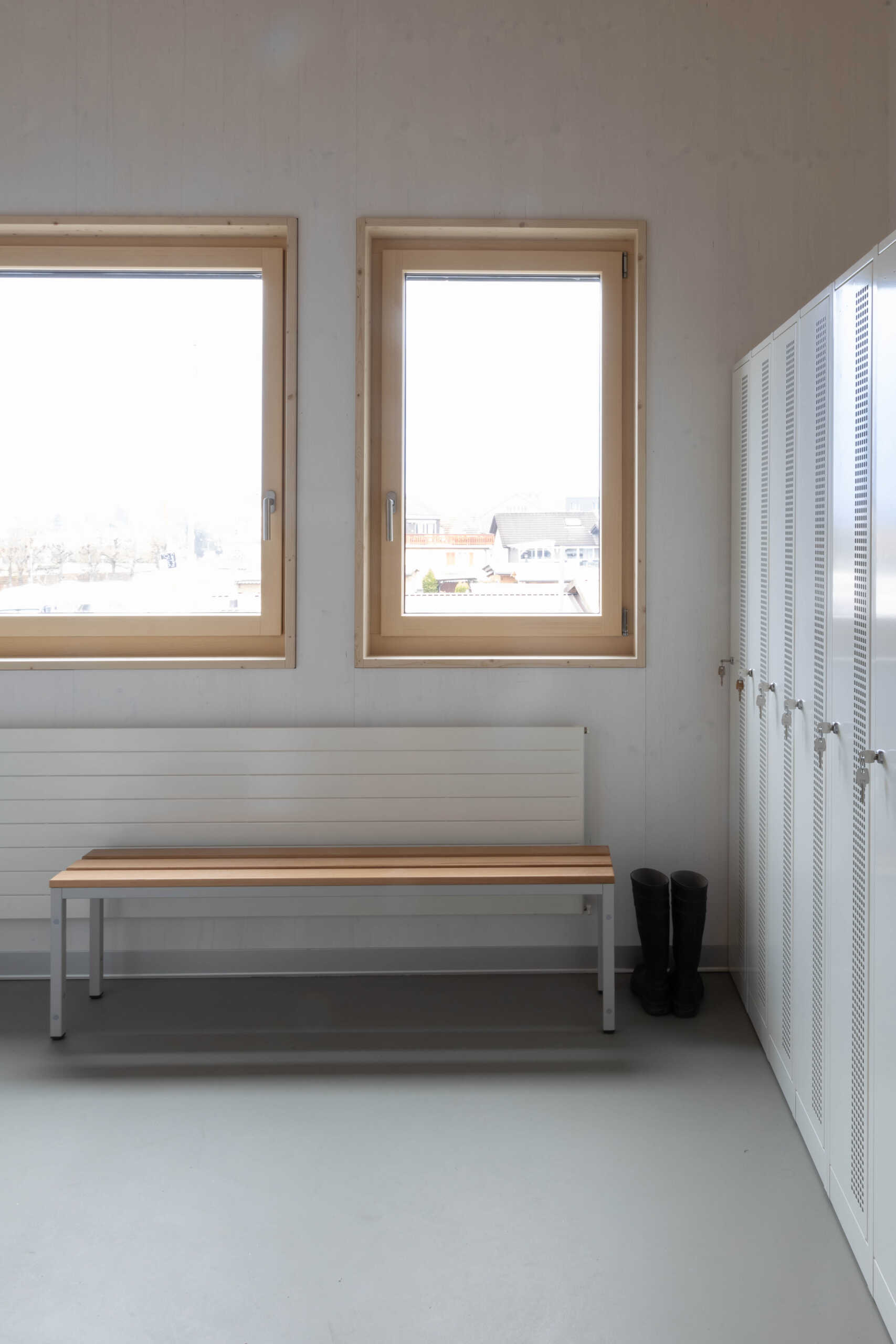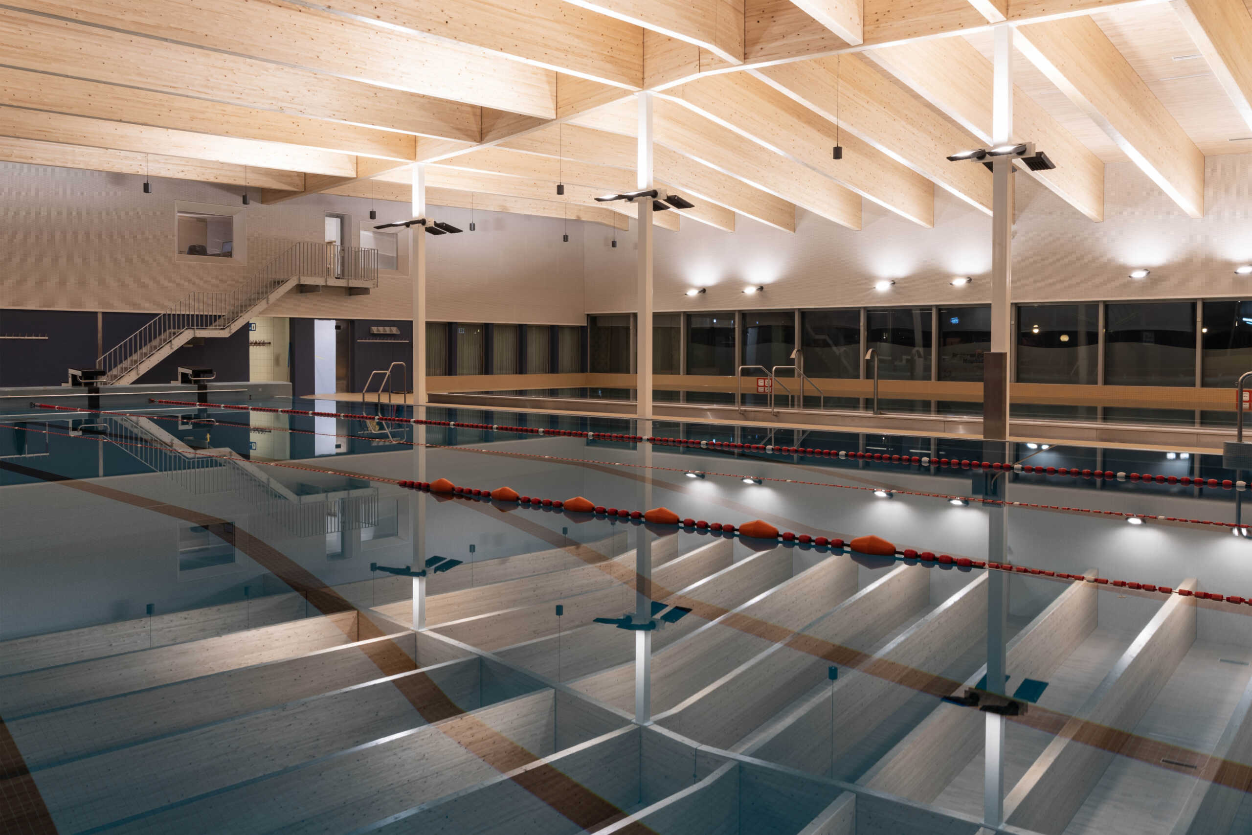 Im Rahmen einer Gesamtsanierung werden in der 1. Etappe die dringendsten Mängel behoben und Raum für Personal und Verwaltung geschaffen. Unter einem Satteldach mit Querfirst sind die bestehende Schwimmhalle sowie die geplante Aufstockung zusammengefügt.