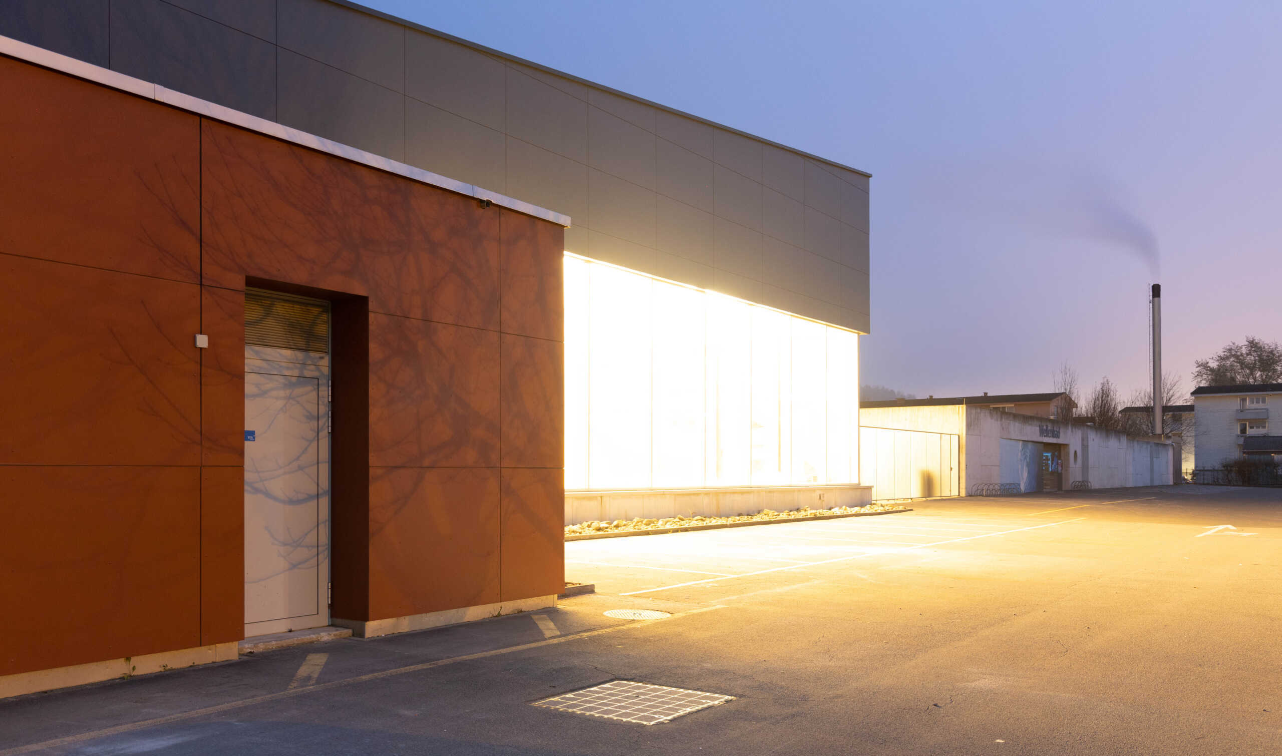 Die neue Holzkonstruktion macht die aufwändige Sanierung der bestehenden Stahlstruktur obsolet. Die Lasten werden auf die bestehenden Stützen und Wände übertragen, womit das statische System vorgegeben ist. Das Haupttragwerk in Holz liegt auf den bestehenden Tragachsen und besteht aus Vollholzträgern, welche der Geometrie der Dachhaut folgen. Mit der Neigung der Dächer ist die Basis für eine Photovoltaikanlage geschaffen. Neigungs- und funktionsgerecht wird die Dachfläche mit einem Blech-Stehfalzdach gedeckt. Die Fassade wird mit Eternitplatten verkleidet.