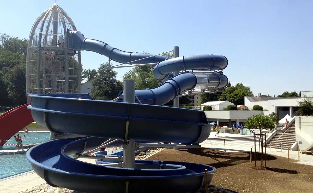 Das Sanierungskonzept greift Kloten auf. Die Wegeführung entspricht den Pisten des Flughafens, die Rakete im Nicht den integrierten Rutschbahnen symboli symbolisch für die Luftfahrt). Ein neuer Wellnessbereich mit Sauna und Dampfbadbereich sowie ein Strömungskanal runden das Konzept ab.